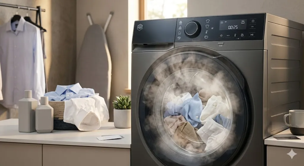 - Bosch / Siemens (Iron Assist / smartFinish): Diese Programme stoßen am Ende des Trocknungsprozesses einen feinen Dampfnebel aus, der trockene Kleidungsstücke gezielt glättet. Ideal, um das Business-Outfit vom Vortag morgens in 20 Minuten wieder in Form zu bringen.