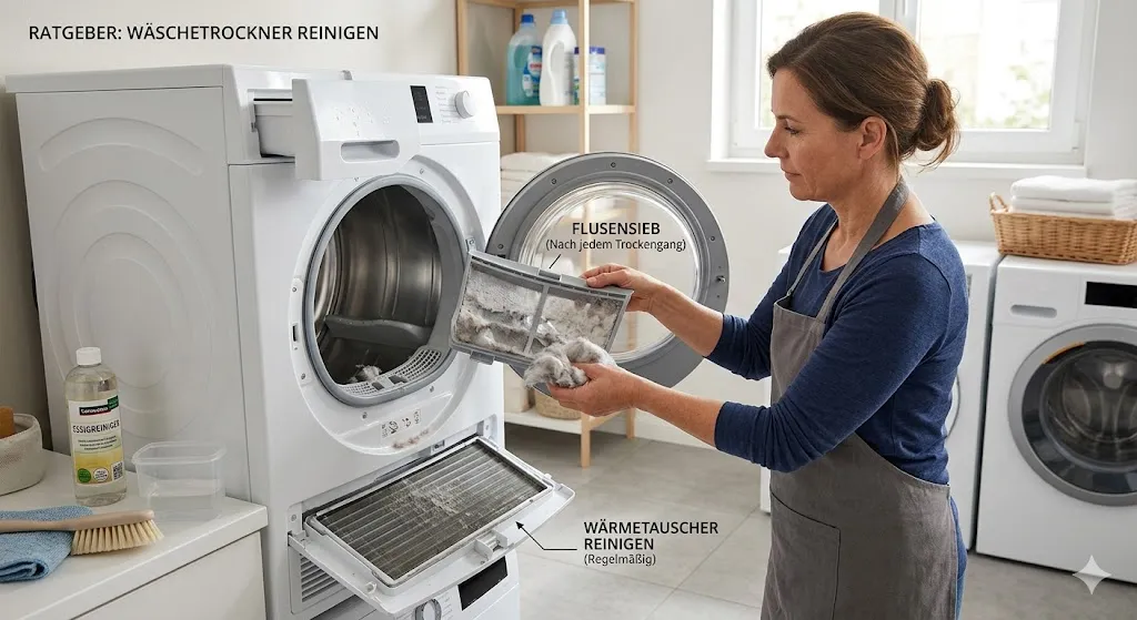 Hier unterscheidet sich die Reinigung je nach Trockner-Typ massiv. Ein verstopfter Wärmetauscher ist der Hauptgrund für extrem lange Trocknungszeiten.