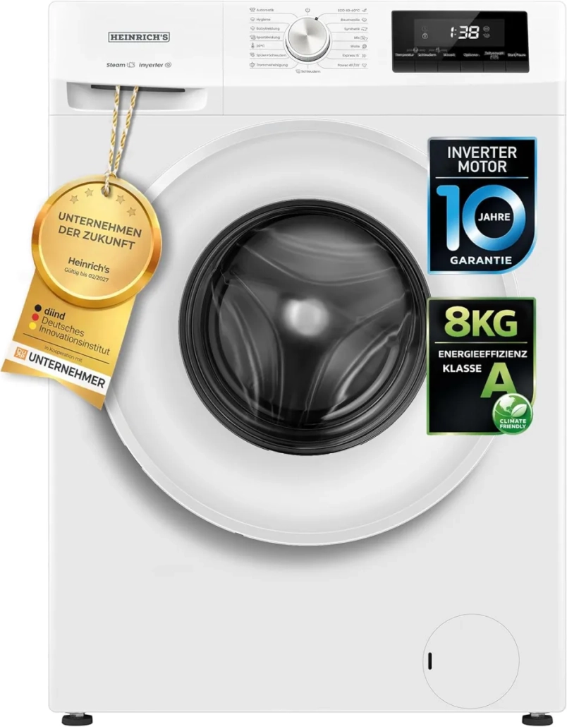 Die Heinrich´s Waschmaschine HWM 6108.1W ist eine moderne, ausgewogene und alltagstaugliche Waschmaschine für alle, die eine gute Mischung aus Kapazität, Effizienz und praktischer Ausstattung suchen. Ihr bekommt hier 8 kg Fassungsvermögen, 1.400 U/min, Energieklasse A und mehrere Funktionen, die im Alltag wirklich sinnvoll sind. Besonders die Kombination aus Steam-Funktion, Aqua-Stop, LED-Display, Timer und Inverter-Motor macht das Modell interessant. Wenn Ihr eine Waschmaschine mit 8 kg sucht, die im Alltag stark, unkompliziert und angenehm vernünftig ausgestattet ist, dann ist die Heinrich´s Waschmaschine HWM 6108.1W definitiv ein Modell, das Ihr näher anschauen solltet.