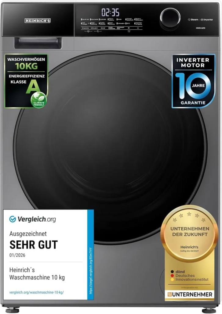 Die Heinrich´s Waschmaschine HWM 6110 W ist eine große, moderne und alltagstaugliche Waschmaschine für alle, die viel Wäsche bewältigen und dabei nicht auf Komfort verzichten möchten. Ihr bekommt hier 10 kg Fassungsvermögen, 1.400 U/min, Energieklasse A und mehrere Funktionen, die im Alltag wirklich sinnvoll sind. Besonders die Kombination aus Steam-Funktion, Aqua-Stop, LED-Display, Endzeitvorwahl und Inverter-Motor macht das Modell interessant. Wenn Ihr eine Waschmaschine mit 10 kg sucht, die viel Platz, moderne Technik und einen guten Alltagsnutzen bietet, dann ist die Heinrich´s Waschmaschine HWM 6110 W definitiv ein Modell, das Ihr näher anschauen solltet.