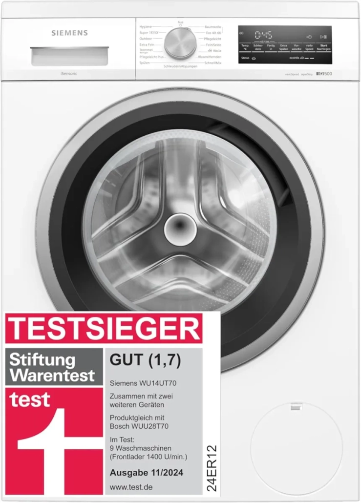 Was die Siemens WU14UT70 Waschmaschine besonders attraktiv macht, ist die Mischung aus vernünftiger Größe, guter Schleuderleistung und Funktionen, die man wirklich regelmäßig nutzt. Mit speedPack L, 15-Minuten-Programm, Outdoor-Programm, iQdrive-Motor, waterPerfect Plus und softTrommel wirkt das Gerät nicht wie irgendein Standardmodell, sondern wie eine Waschmaschine, die klar auf den echten Alltag ausgelegt ist.